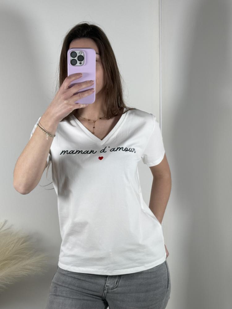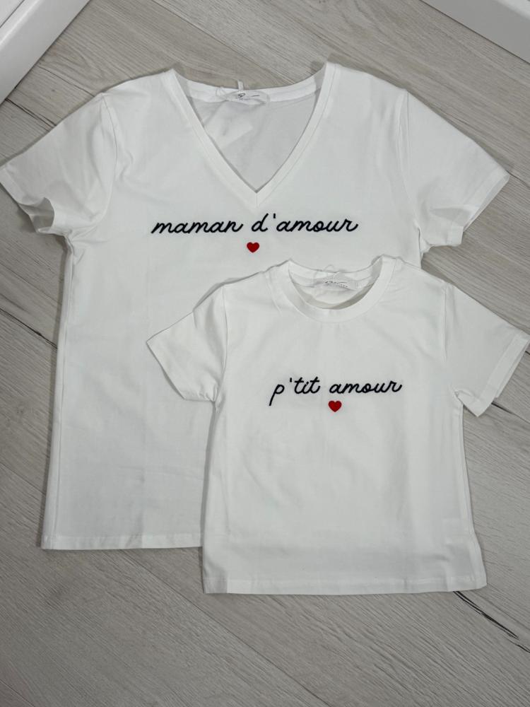 • T-shirt blanc, avec broderie de couleur bleu & rouge “maman d’amour” • Existe en “p’tit” amour” pour enfant de 2 à 12 ans
